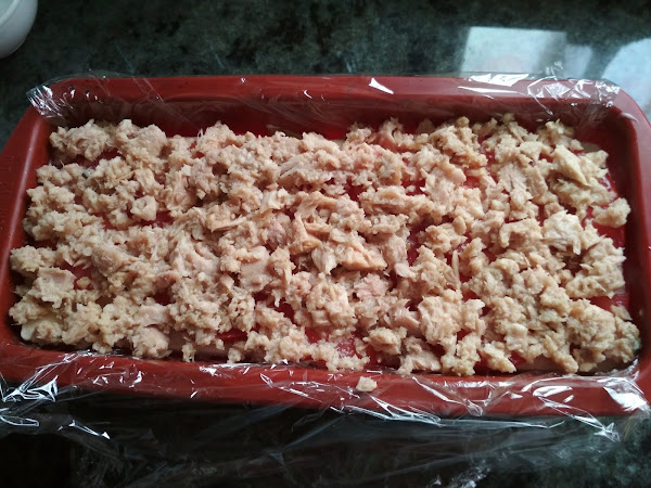 Me gusta prepararlo con antelación y meterlo un par de horas en la nevera para que cohesione sin tener que poner mucha mahonesa. Para eso lo hago con un molde de plum cake forrado con film, así lo puedo apretar sin miedo a que se desmorone.