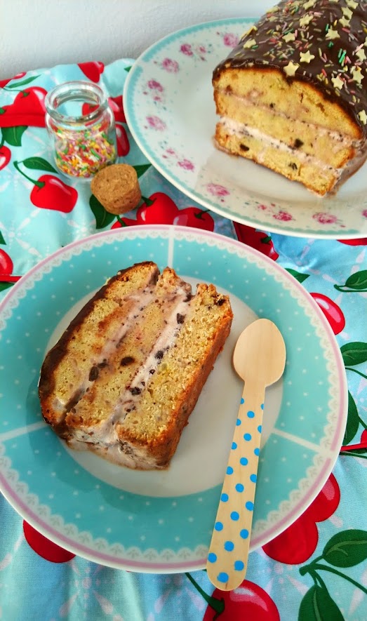 Ya sólo nos queda preparar la cobertura. Para ello disolvemos el chocolate junto a la leche en el microondas en tandas de 20 segundos. Cuando casi esté, agregamos una cucharadita de miel o golden syrup. Añadimos al pastel y decoramos con los adornos de azúcar que queráis. Yo utilicé estrellas de chocolate y fideos de colores estilo confetti. Volvemos al congelador. Lo retiramos unos 15 minutos antes de servir. Cortamos a rebanadas. Lo consumiremos durante la semana.