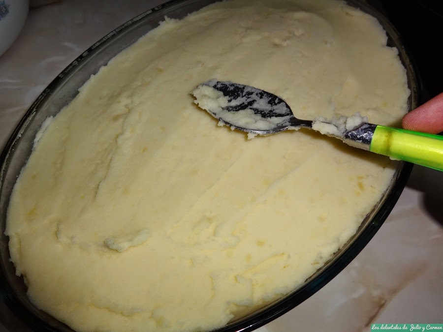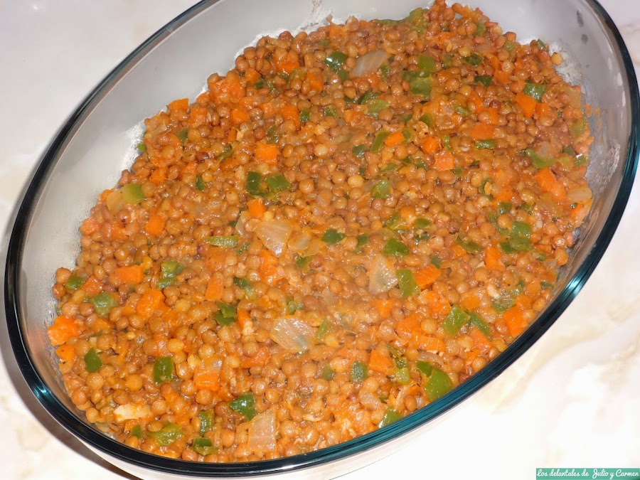 En una fuente de horno, ponemos de base el preparado de verduras y lentejas, y cubriéndolo, el puré de patatas, el cual extenderemos por toda la superficie.