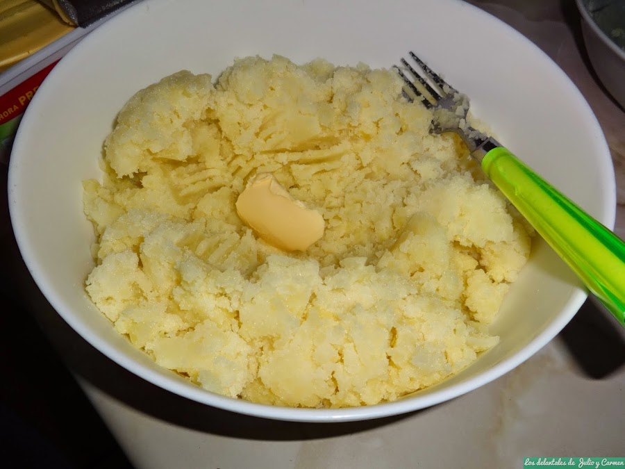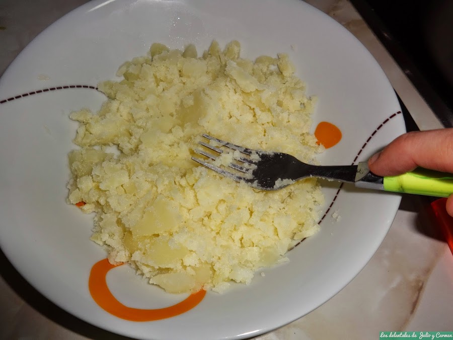 Por otro lado, pondremos a cocer en agua con sal, las patatas peladas y cortadas en trozos. Cuando estén tiernas, las sacamos y escurrimos. En un bol, las aplastamos con un tenedor formando un puré con ellas.