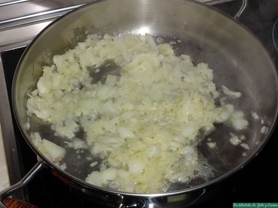 Pochamos en una sartén con aceite, a fuego medio-bajo, la cebolla con el ajo. Cuando este dorada la cebolla, echamos el pimiento y la zanahoria. Salamos ligeramente y removemos.