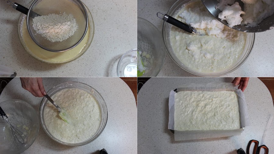 Añadimos la harina poco a poco a la mezcla anterior y las claras montadas poco a poco y con movimientos envolventes para que no se nos bajen las claras.