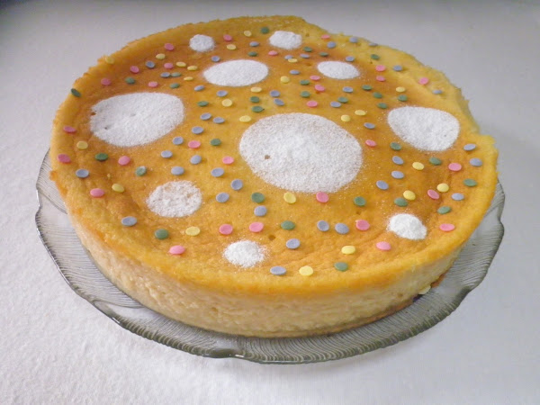Una vez hecho, dejar enfriar y desmoldar. Y por último decorar, yo en este caso con una plantilla de círculos espolvoreé azúcar glass y además puse virutas de colores.