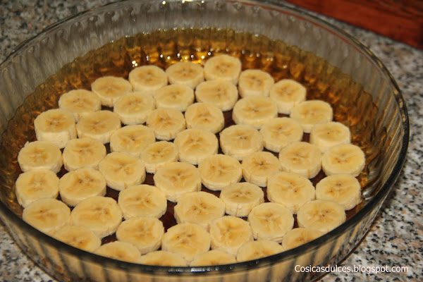 Forramos con rodajas de plátano (y reservamos todo el plátano restante).