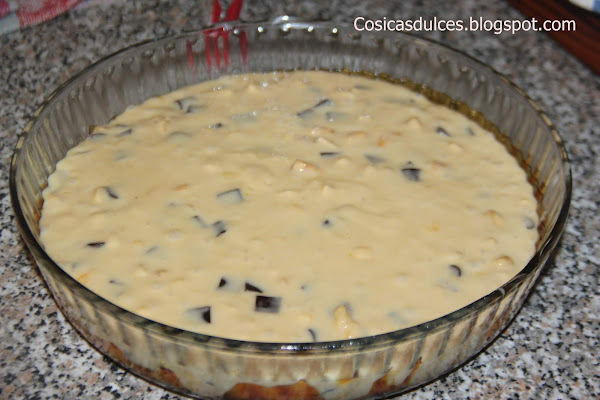 Vertemos toda la mezcla en el molde que teníamos reservado y horneamos con el horno precalentado a 180 grados unos 25 minutos.