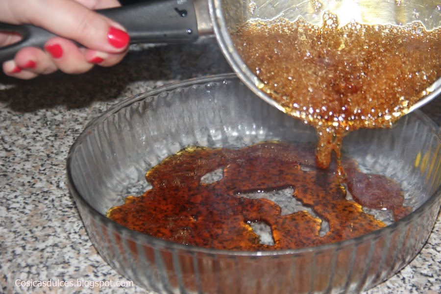 Comenzamos preparando un caramelo con la mitad del azúcar (200 gramos) que verteremos sobre un molde de horno de unos 23 centímetros.