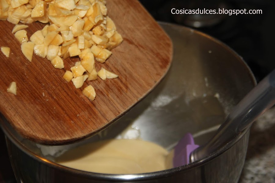 Añadimos, seguidamente, la leche, el plátano cortado a trozos pequeños y las pepitas de chocolate.