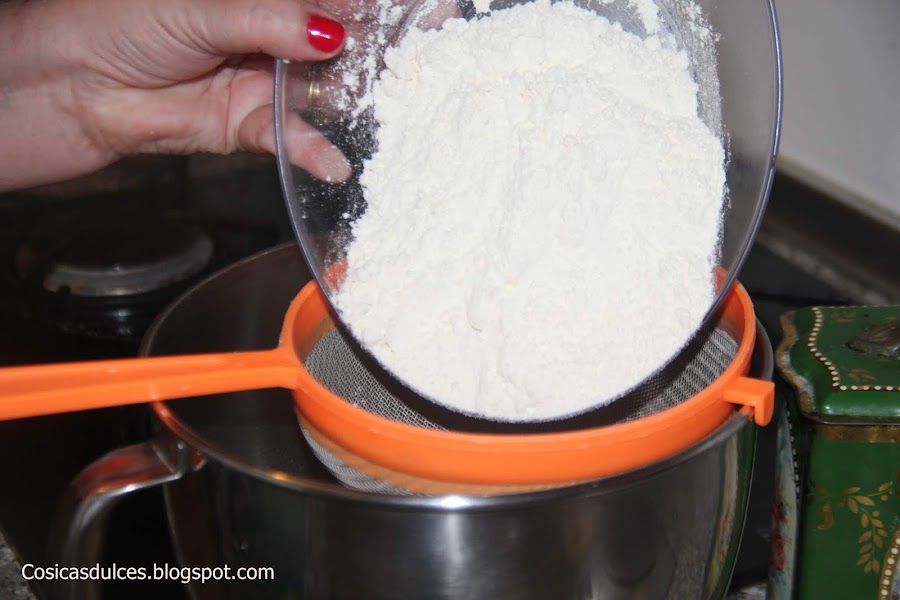 En un bol batimos hasta que blanqueen los huevos con el azúcar y cuando tengamos una mezcla muy cremosa añadimos la harina tamizada junto a la levadura.
