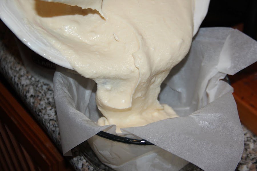 Vertemos la mezcla en un molde de 18 centímetros forrado de papel de hornear.