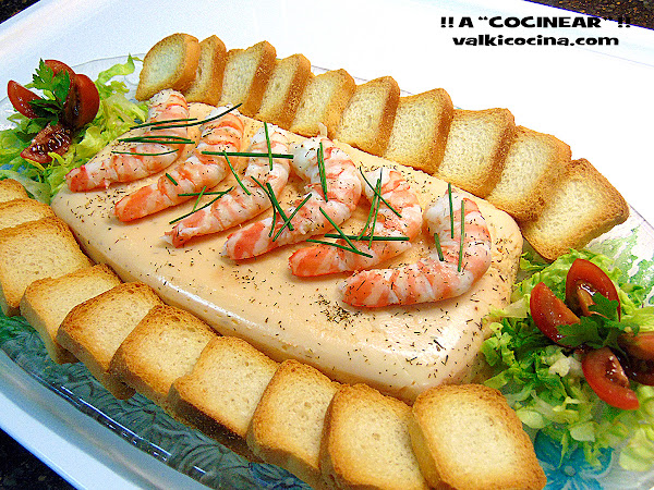 Éste pastel de langostinos, tiene la peculiaridad de tener una suave textura de mousse, pero a la vez es lo suficientemente consistente para poder servirlo individualmente como entrante cortado en porciones, .. o untado en tostas para poder elaborar canapes, .. o que cada cual se sirva de la fuente donde lo presentemos.