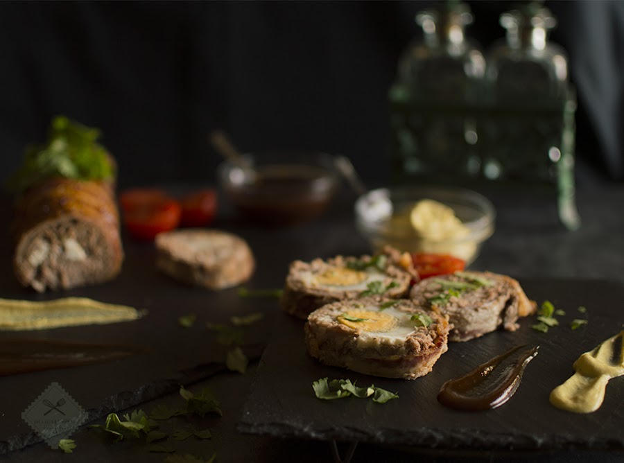 Cortamos en lonchas el queso feta y ponemos la mitad repartido encima de la carne. Colocamos tres huevos un poco separados y, ayudándonos del papel de hornear, le damos forma de rollo a nuestra carne. Hay que procurar apretar y formar bien el rollo para que en el horno no se nos abra.