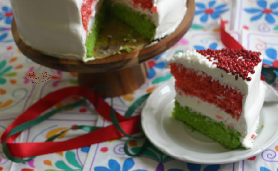 Una vez que el pastel reposo en el refrigerador divide la base en tres partes y decora con las grageas de colores formando la bandera, yo me ayude de una regla para que no se me pasaran de un lado a otro
