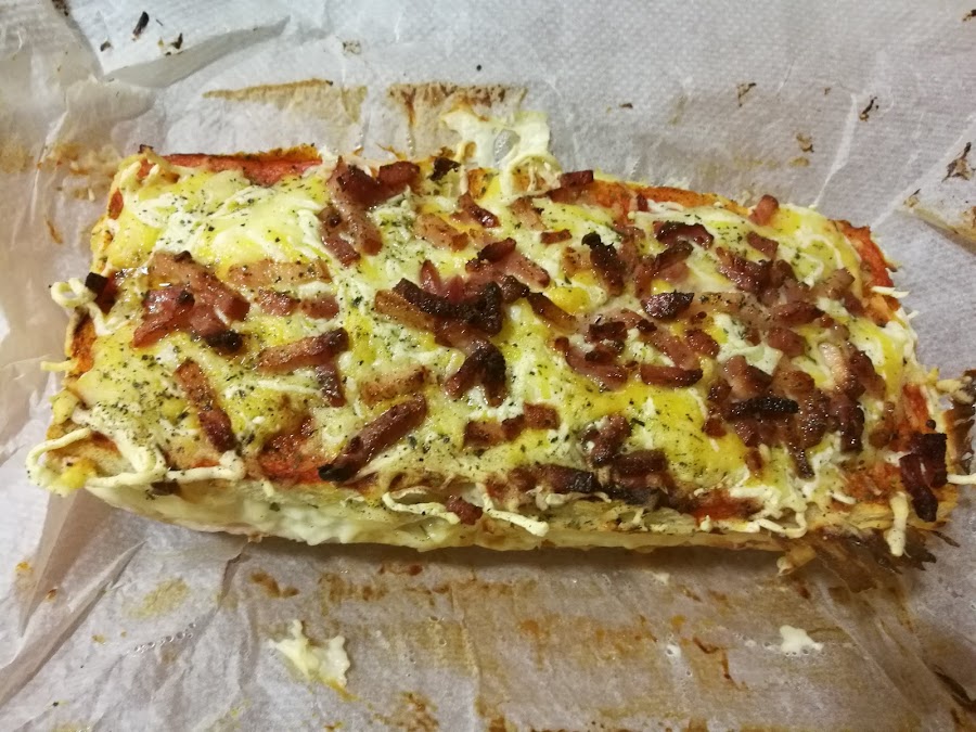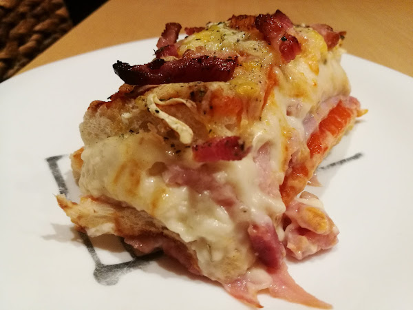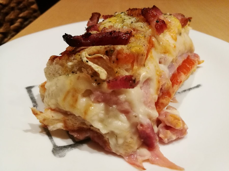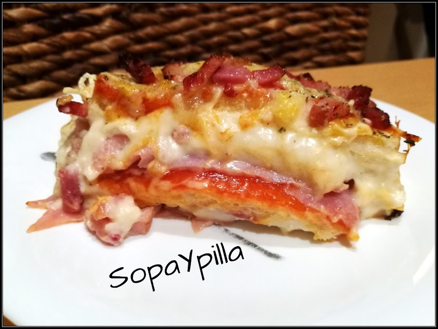 - Ahora ponemos el jamón, bechamel y bacon. Repetir capas hasta acabar con pan. Espolvorear el queso rallado, bacon y orégano.