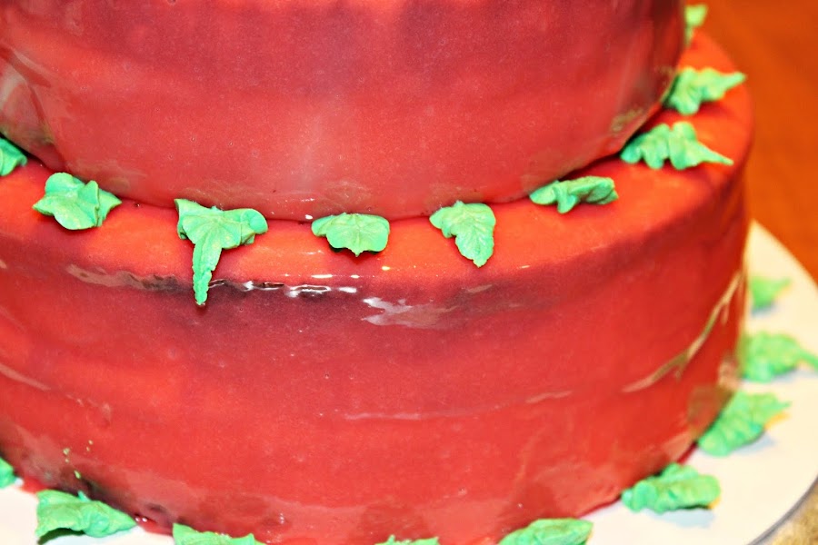 Hice una cobertura espejo de chocolate blanco y lo decoré con flores y hojas hechas con crema de mantequilla.