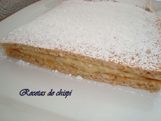 En una parte del bizcocho poner la crema y extender bién, tapar con la otra parte y espolvorear con azúcar glas.