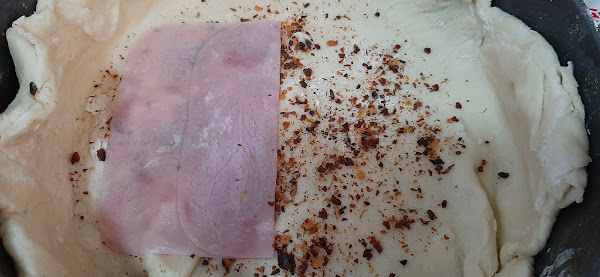 4.- Colocamos la masa en el molde y espolvoreamos la base con aji molido. Después ponemos dos lonchas de jamón york y encima el provolone que taparemos con las otras dos lonchas de york.