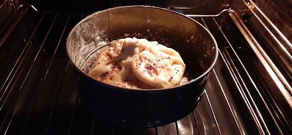 1.- Precalentamos el horno a 180º y preparamos un molde desmoldable que pincelaremos con aceite y espolvorearemos con harina. Si preferís podéis forrarlo con un papel de hornear. El diámetro del molde no debe ser muy grande. Yo use uno de 20 cm y me sobró, pero como no tenía otro más pequeño, utilicé este.