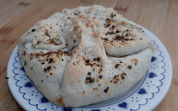 5.- Espolvoreamos con aji de nuevo y cerramos el masa, dándole la forma de un saquito. Yo volví a espolvorear con aji molido y hornee unos 20 minutos por abajo. Como cada horno es distinto, el tiempo es relativo y por eso cuando lo veáis dorado por arriba, es cuando estará hecho.