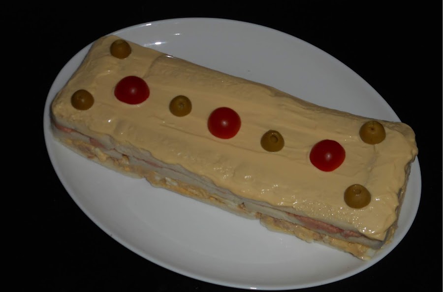 Desmoldamos, echamos un poco de mayonesa por encima, colocamos los tomates cherry y las aceitunas y ya está listo para llevar a la mesa.