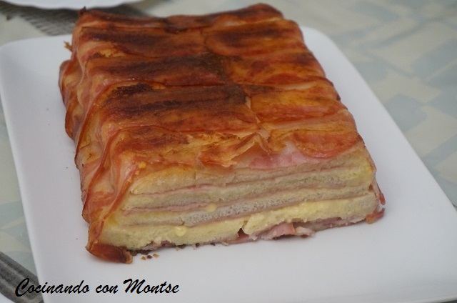 Pastel salado de pan de molde con jamón, queso y bacon