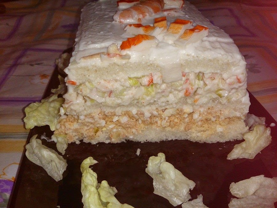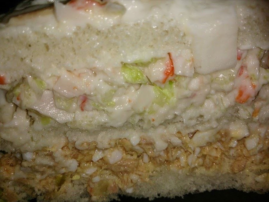 Poner una capa de pan de molde y cubrir con el primer relleno. Poner otra capa de pan de molde y echar el segundo relleno, tapar con otra capa de pan y meter en la nevera un rato para que se enfríe.