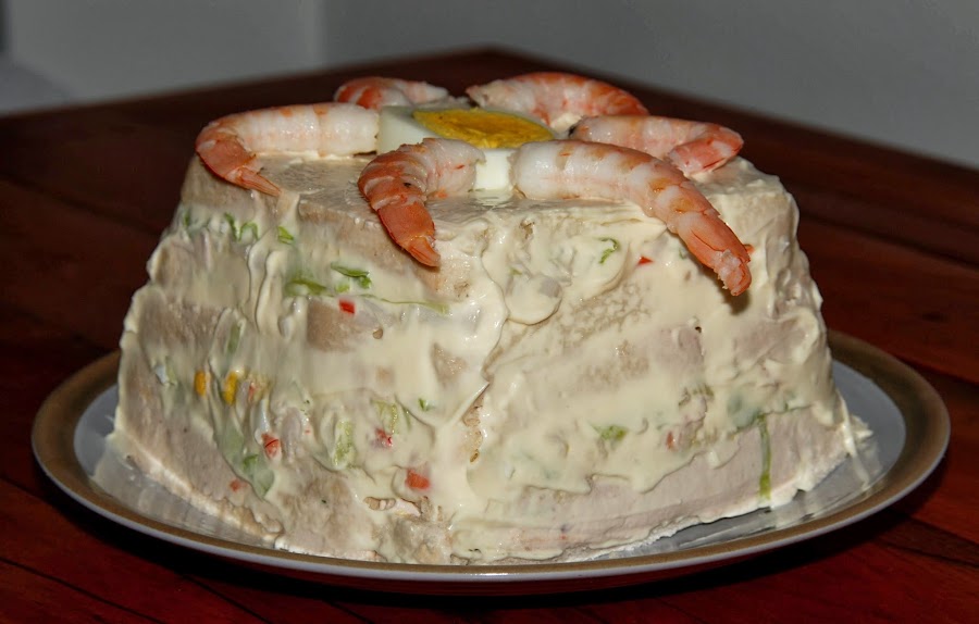 Desmoldar, cubrir la superficie con mahonesa y decorar con langostinos y huevo cocido.
