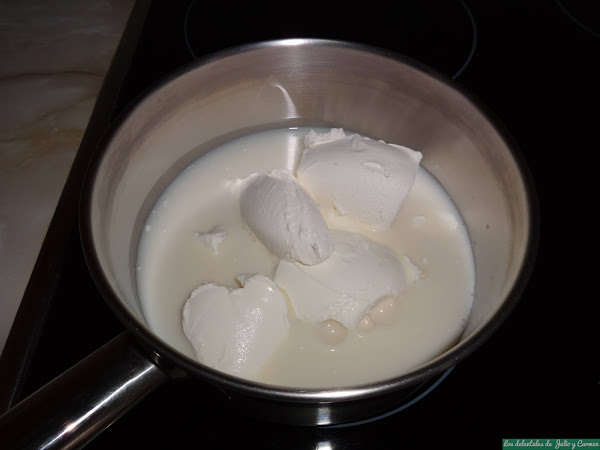 Pondremos en un cazo el queso junto con la leche y encendemos el fuego. Mientras comienza a calentarse, en un vaso con agua fría sumergimos las hojas de gelatina para que vayan hidratándose.