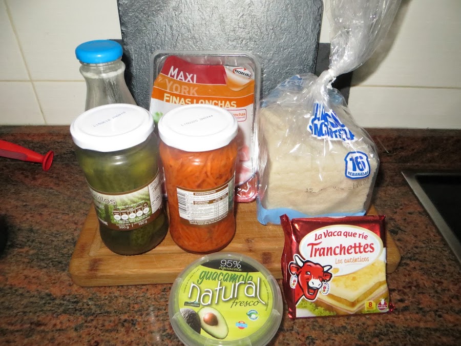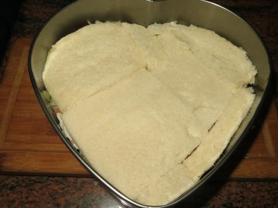 Una vez que tenemos la base cubierta, untamos una capa de guacamole, lo podéis realizar casero, aunque yo compro uno de la marca mercadona que da muy buen resultado. Encima colocamos las lonchas de jamón york y queso. Colocamos otra capa de pan de molde y la siguiente mezcla que está compuesta de lechuga, zanahoria rallada, cebolla y mayonesa, una especie de ensalada de col americana, pero un poco cambiada y colocamos otra capa de pan de molde. Yo sólo he puesto tres capas de pan de pan de molde con tres rebanadas cada una, pero le podéis añadir más, dependen de las personas que seáis, aunque tener en cuenta que estos pasteles llenan mucho.