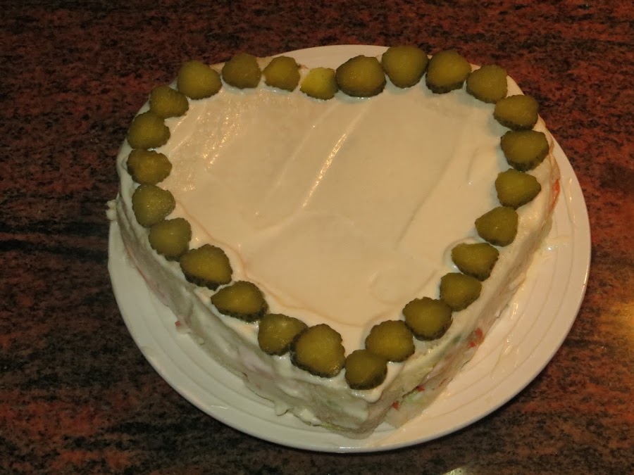 Desmoldamos el pastel y le damos la vuelta, ya que la base estará mejor prensada que la parte de arriba. Untamos una generosa capa de mayonesa por la parte superior del pastel y por los laterales y lo adornáis como más os guste, yo en este caso simplemente le he puesto pepinillos, pero podéis colocarle anchoas, pimientos, la yema de un huevo duro rallada, tomates cherry…
