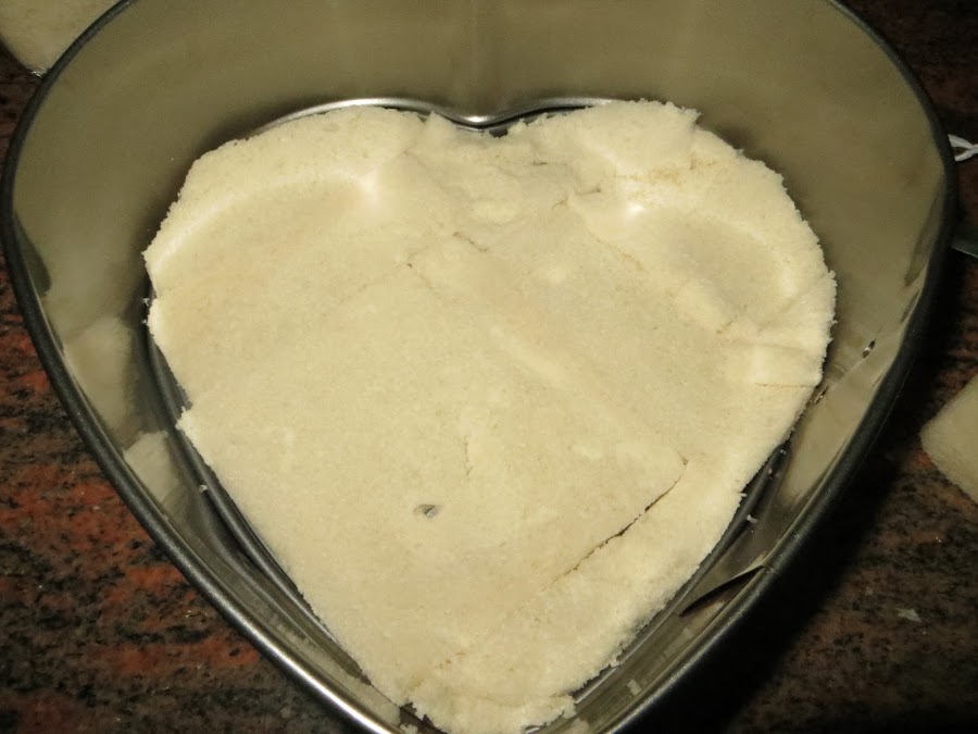Cogéis un molde desmontable donde vayáis a realizar el pastel, en mi caso con forma de corazón para celebrar San Valentín y colocáis en el fondo una capa de pan de molde, si no es para San Valentín os aconsejo que el molde que utilicéis sea rectangular o cuadrado, ya que es más sencillo.