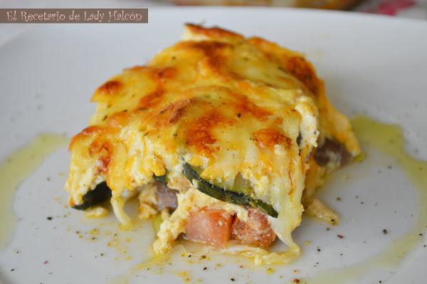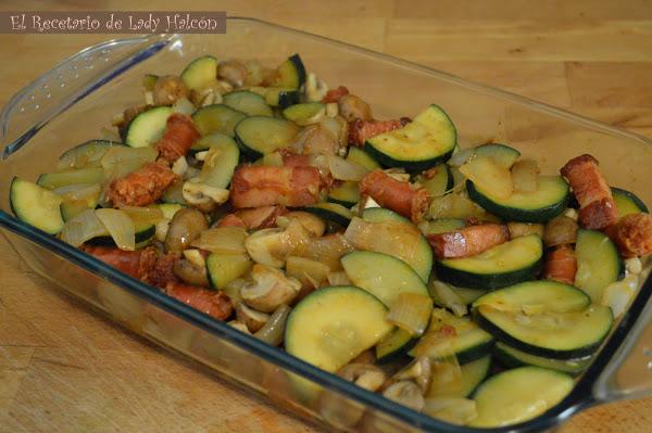 Como con estos calores yo no soy persona, volví a coger al cocinillas por banda y le pedí que me ayudara con el plato que íbamos a comer ayer. Y, como ya os he comentado antes, tras dar un montón de vueltas, seleccionar unas cuantas e ir descartando otras tantas, nos quedamos con este pastel de verduras, bacon y chistorra y salimos corriendo a comprar lo que nos hacía falta.