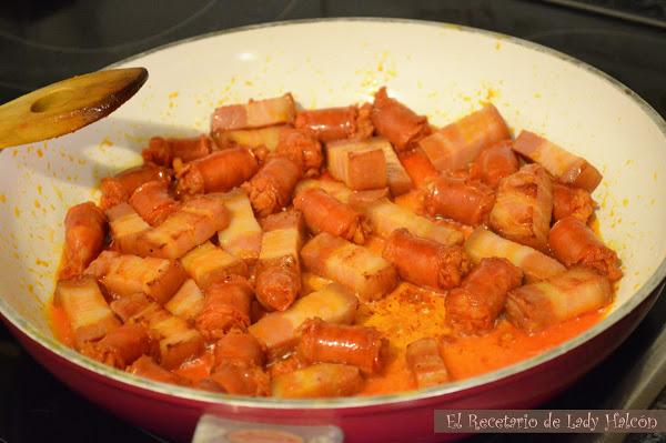 Añade de nuevo el bacon y la chistorra, remueve para que se mezclen y retira la sartén del fuego.