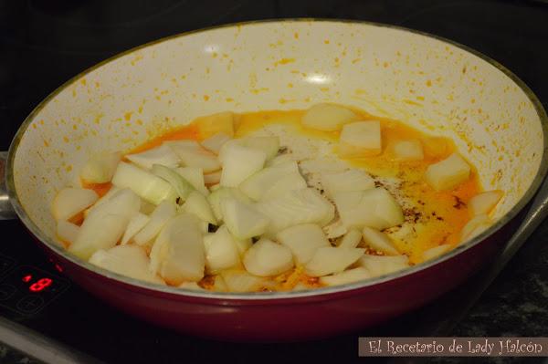 Cuando estén hechos, retíralos de la sartén y reserva en un plato. Quita un poco de aceite de la sartén si ves que te hay en exceso y añade la cebolla.