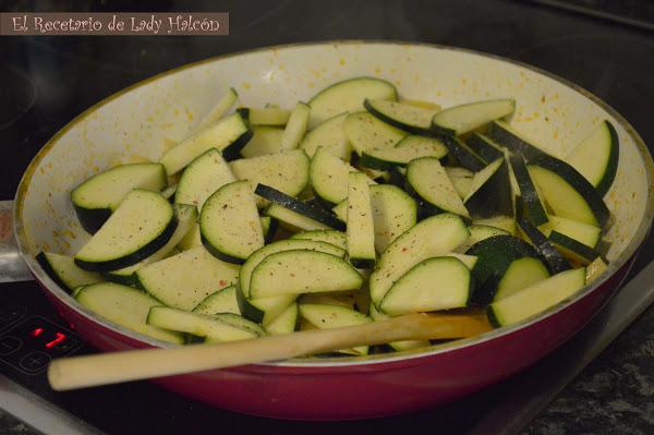 Cuando la cebolla comience a estar blanda y transparente, añade el calabacín, salpimienta y remueve de vez en cuando para que no se pegue.