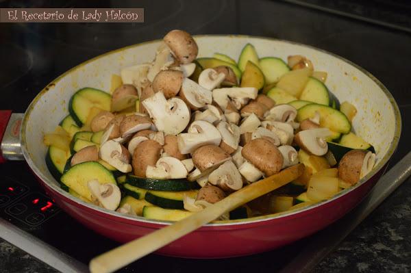 Espera a que el calabacín coja color y esté blando para añadir los champiñones. Remueve y deja que se hagan unos minutos.