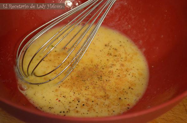 Para el resto de la masa, bate en un bol los huevos, añade un poco de pimienta, sal y nuez moscada y remueve.