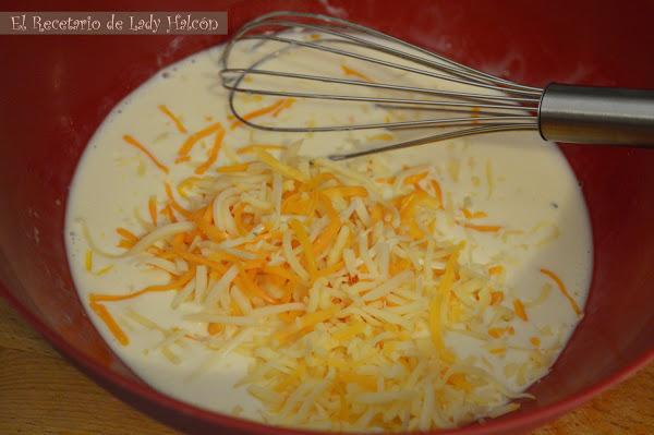 Añade la nata (crema de leche) y la mezcla de quesos y vuelve a remover para que se mezcle todo bien. Reserva.