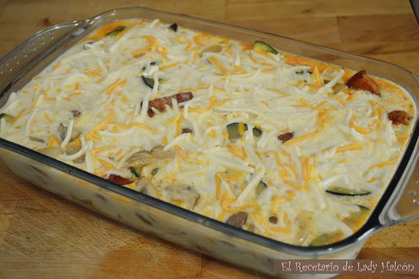 Vierte por encima la masa de huevos, queso y nata (crema de leche) procurando que cubra todo. Da unos pequeños golpes para que se cuele bien por todos los rincones.