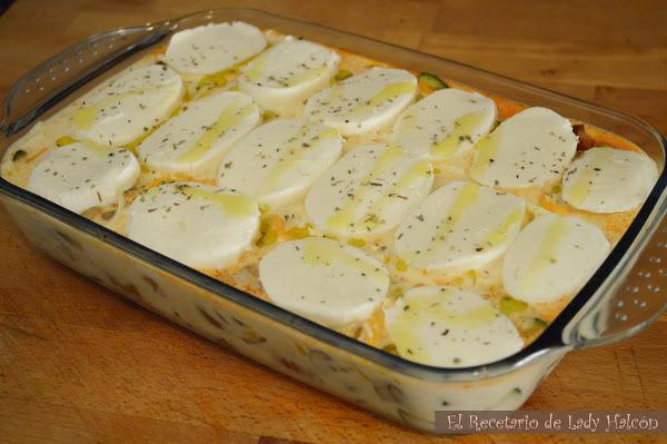 Ya solo queda cortar la mozzarela en rodajas y cubrir con ella la superficie de toda la bandeja. Si quieres puedes añadir un poco de orégano y un chorro de aceite de oliva.