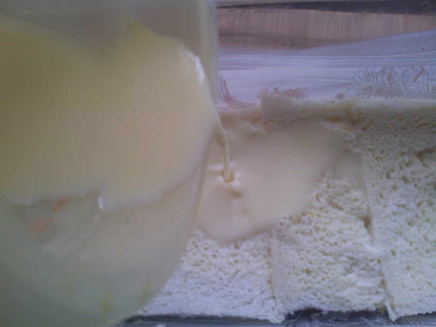 Poner otra capa de pan de molde bañar con la leche y otra capa de jamón y queso.