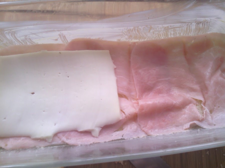 7- Cubrir el pan con 3 lonchas de jamón y 3 de queso.