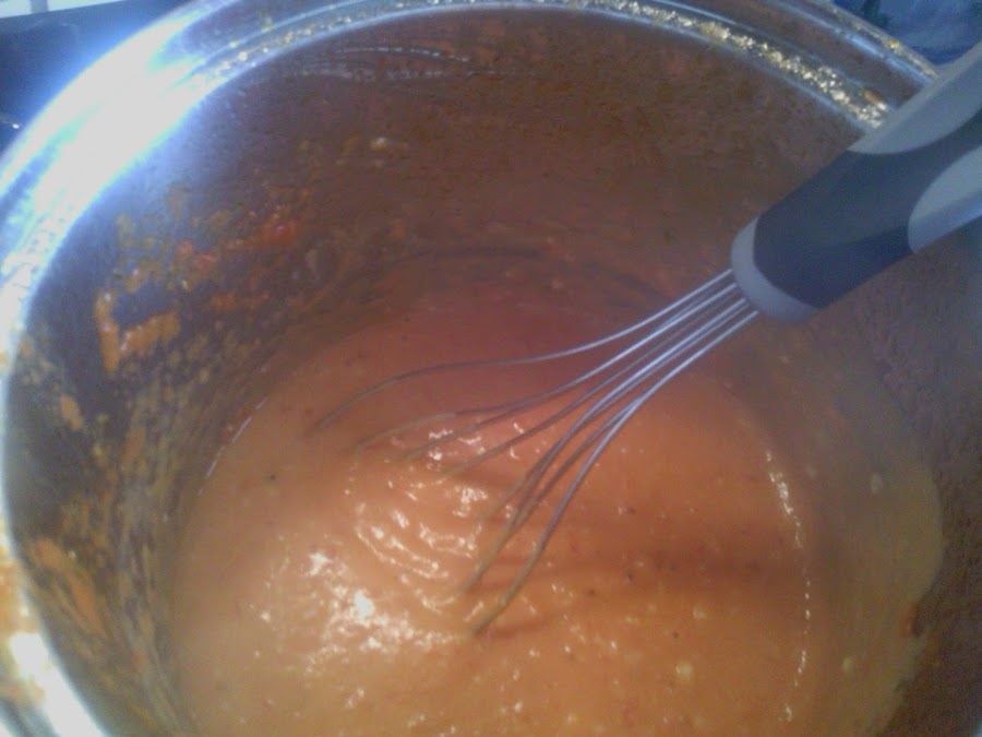 8- Batir a mano la bechamel y el tomate frito, que hemos puesto a calentar,