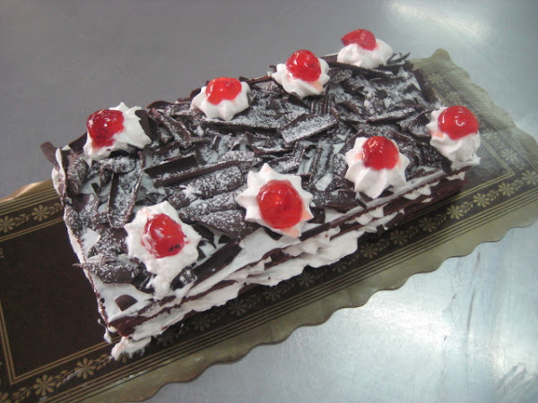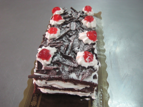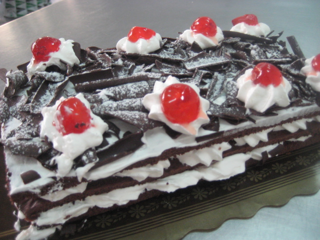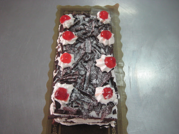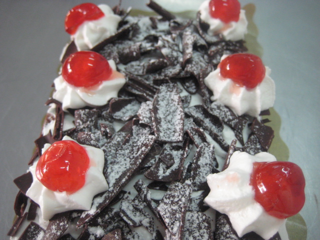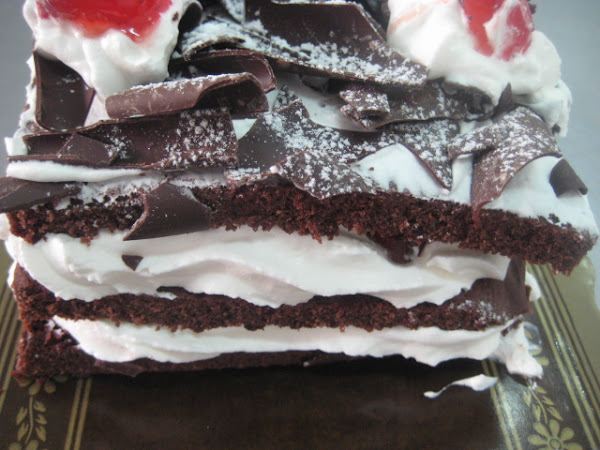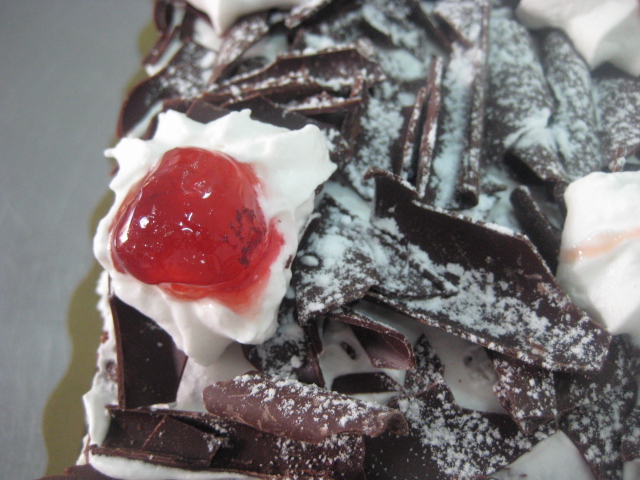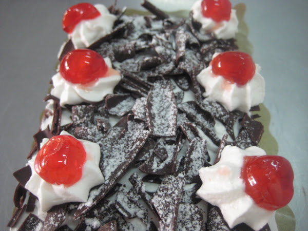 Preparación: Para hacer el bizcocho se bate la mantequilla con el azúcar hasta que esté cremosa, entonces se agregan las yemas de los huevos y se bate de nuevo. Seguidamente se agrega el chocolate fundido y luego la harina tamizada mezclada con la el impulsor. Por último se añaden con cuidado las claras montadas a punto de nieve con un pellizco de sal. Hornear a 180º c durante 15-20 minutos o hasta que al pinchar con una aguja, ésta salga limpia. Dejar enfriar sobre rejilla y cortar la plancha resultante en tres partes iguales. Reservar. Montar la nata (crema de leche) y cuando esté a medio montar agregar el azúcar glas en dos veces. Una vez hecha la nata (crema de leche) reservar en la nevera puesta ya en una manga pastelera con boquilla rizada gruesa. Mezclar la mermelada de cerezas con el kirsch si se quiere, aunque se puede no poner. Untar una de las partes de bizcocho con esta mezcla y luego poner la nata (crema de leche). repetir la operación y terminar con la última parte de bizcocho. Sobre ella extender una fina capa de nata (crema de leche) y luego cubrir todo con virutas de chocolate. Decorar con unas rosetas de nata (crema de leche) y cerezas y finalmente salpicar con azúcar glas, para hacer efecto nevado.
