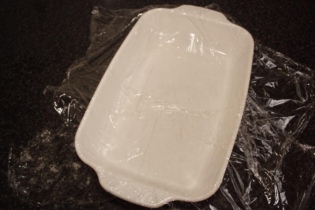Escogemos un molde rectangular (fondo: 13 x 22 cm; bordes: 17 x 25 cm; altura 5 cm) y lo forramos con film transparente, que sobre bastante por los laterales y reservamos.