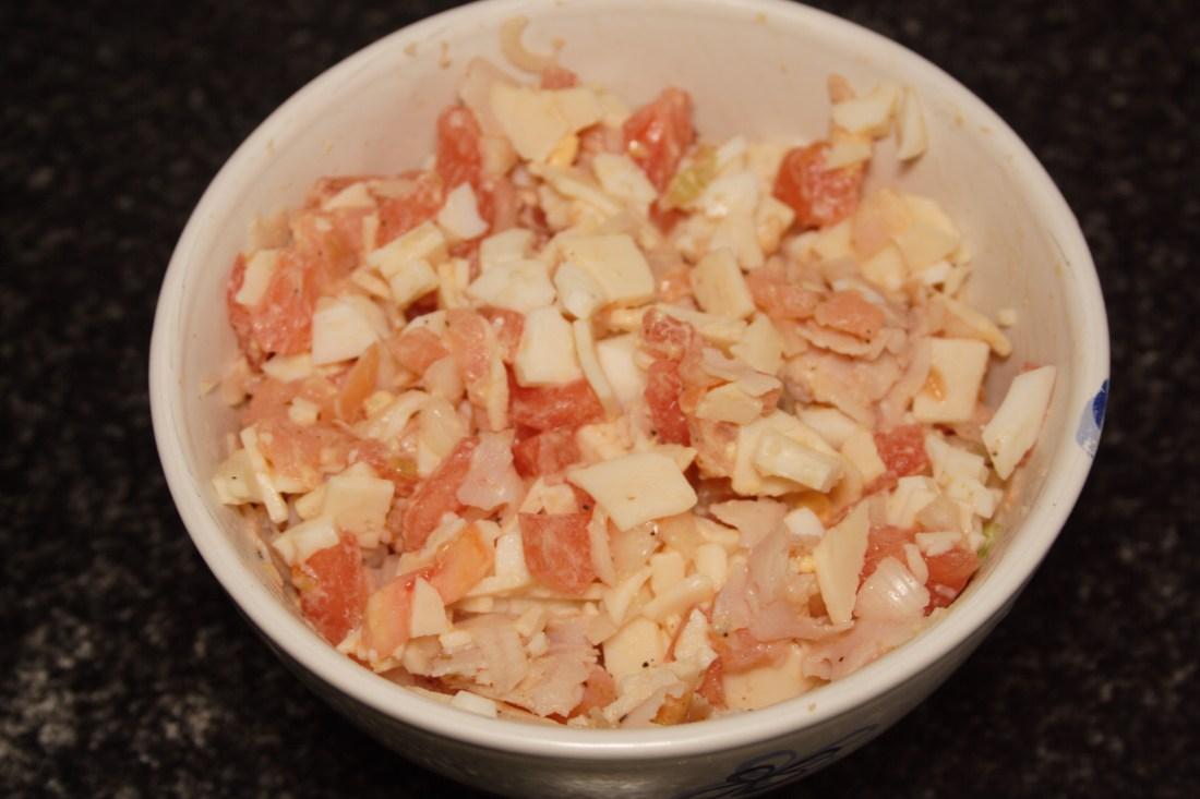 En un bol mezclamos el tomate pelado en daditos, la cebolleta en juliana menuda, un huevo en rodajas o daditos (el otro para decorar), el pavo troceado, el salmón troceado menudo y el queso partido. Salpimentamos y reservamos.