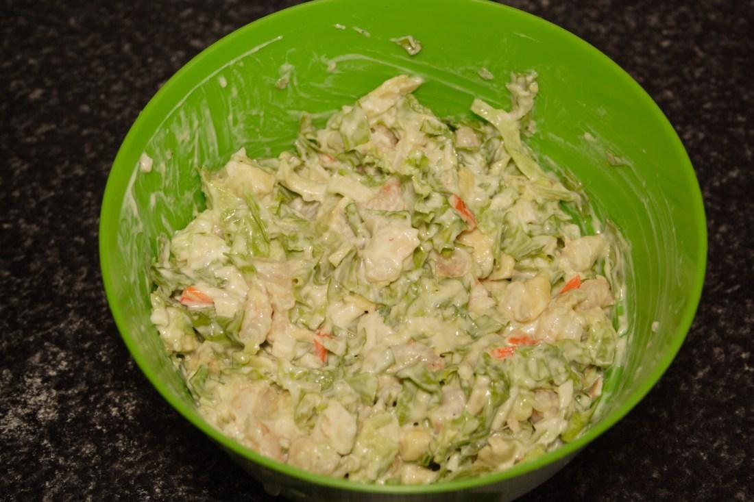 En otro bol echamos las gambas (si queremos reservamos alguna para decorar), el atún desmigado, las hojas de lechuga lavadas y muy picaditas en Juliana, el aguacate en daditos pequeños y los palitos de surimi picados menudos. Envolvemos con un poco de mayonesa, la justa para que se compacten los ingredientes. Reservamos.