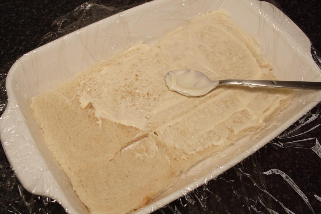 Cubrimos el molde con pan Bimbo, procurando cubrir toda la base. Y lo untamos con mayonesa.