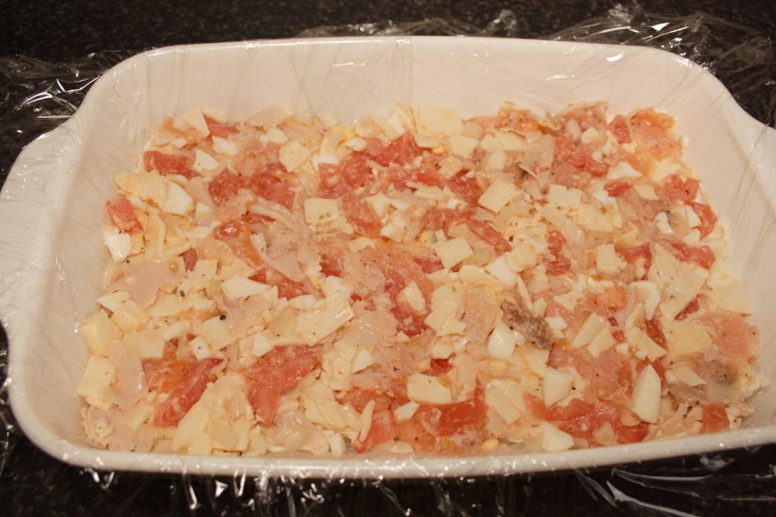 Colocamos por encima la mezcla del tomate, repartimos bien. Vamos compactando bien las capas.