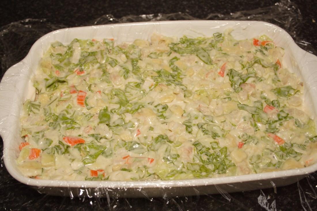 Cubrimos el siguiente piso con la mezcla de las gambas y la lechuga y tapamos de nuevo con Bimbo. Y compactamos de nuevo.