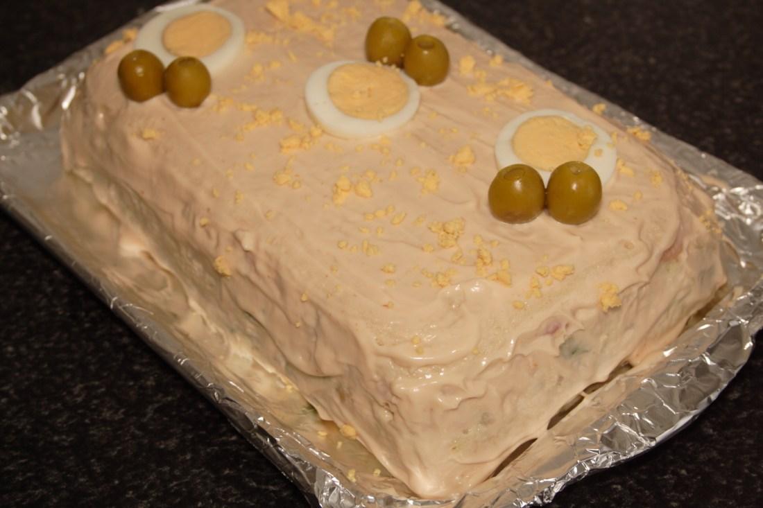 Transcurrido el tiempo, sacamos del frigorífico, desmoldamos con cuidado en el plato o fuente de presentación, cubrimos con una fina capa de la mezcla de mayonesa y kétchup, decoramos con el huevo reservado, o unas aceitunas, tiras de pimiento rojo… A vuestro gusto.
